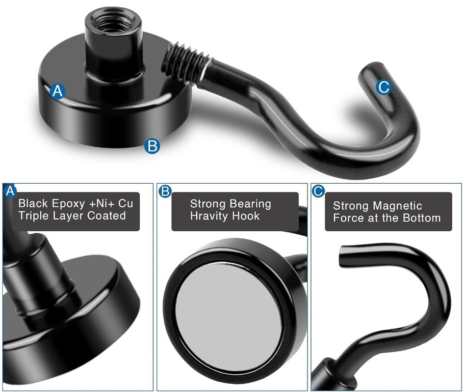 การเคลือบด้วยแม่เหล็กเหนือ:กรงแม่เหล็กนี้เคลือบด้วย 3 ชั้นของ epoxy สีดํา + นิเคิล + ทองแดงซึ่งให้ถ้วยเหล็กที่มีชั้นเคลือบที่กระจ่างและทนทานต่อสนิม ซึ่งปกป้องแม่เหล็กด้วยตะขอ และช่วยป้องกันการแตกหรือแตก.หมวกแม่เหล็กสีดําประกอบด้วยแม่เหล็กเนโอดีเมียมและเหล็ก A3 คุณภาพสูงการดูดของตะขอแม่เหล็กแข็งแรงเป็นหลายเท่าของตะขอโลหะธรรมดา.